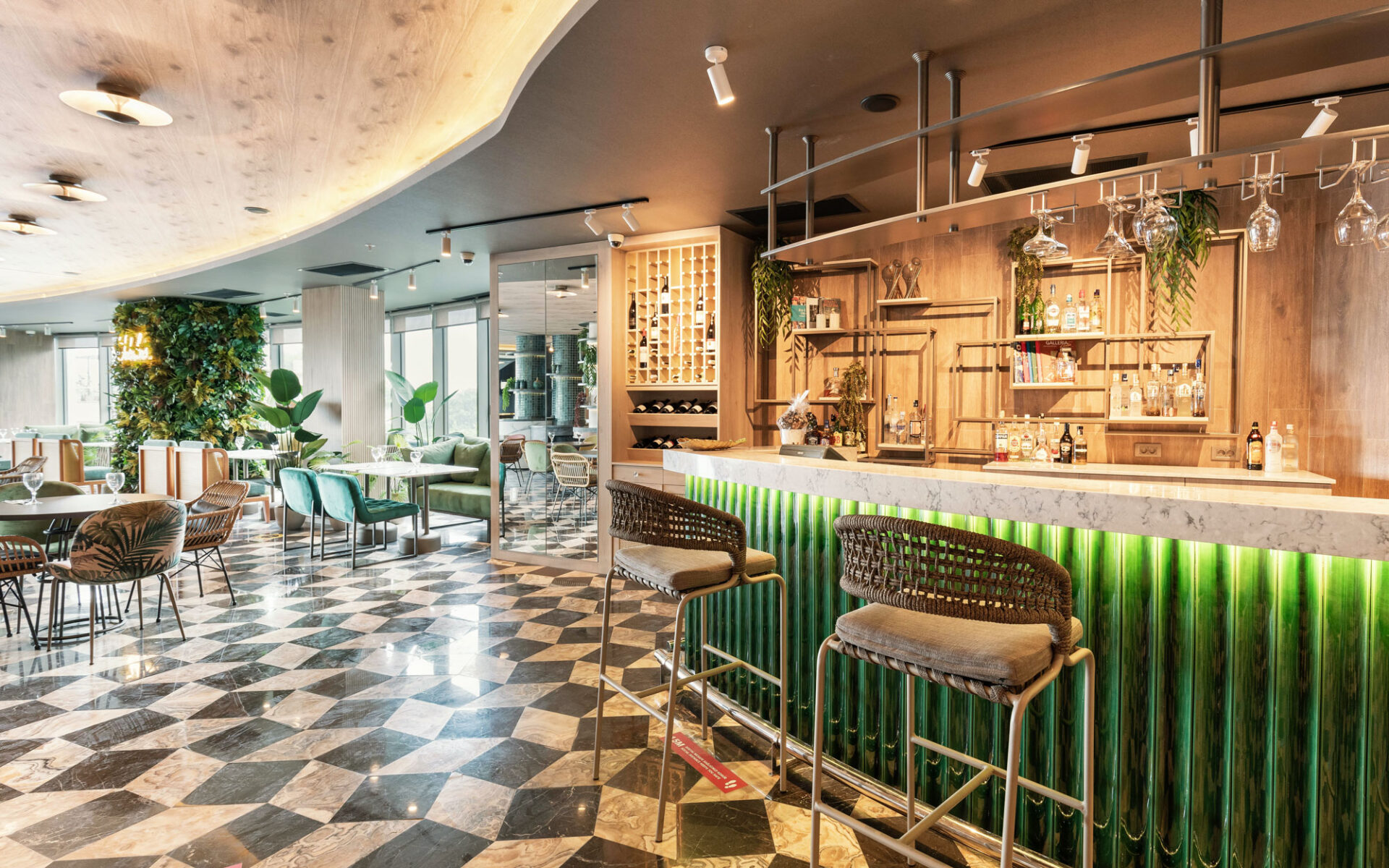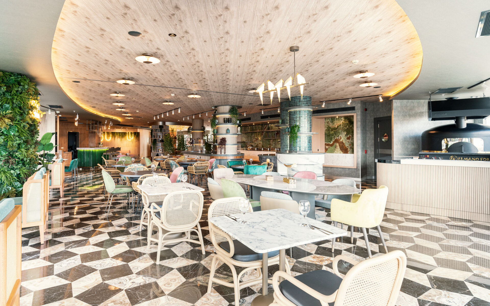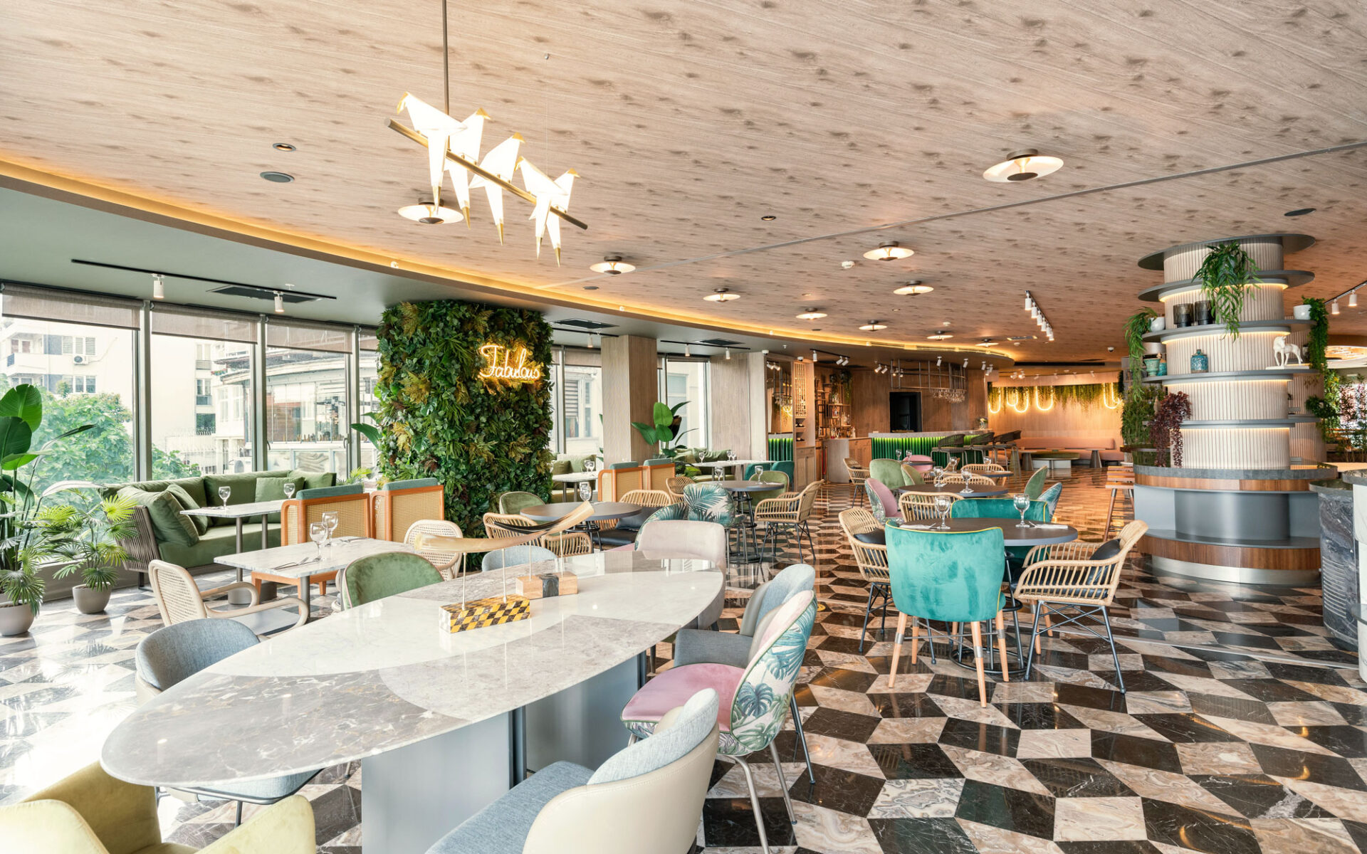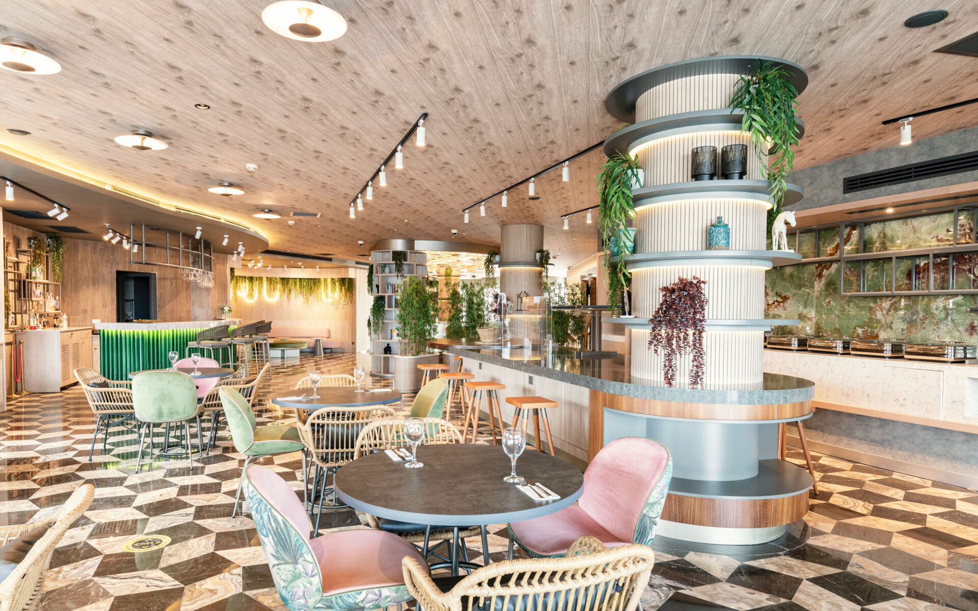 A magnificent coalescence of the patterns applied to both materials and appliances and pastel tones. The walls and the ceilings are designed to be displayed as artworks with the integration of lightning. A dreamy, green design approach welcomes the visiters with it’s energetic, joyful elegance.