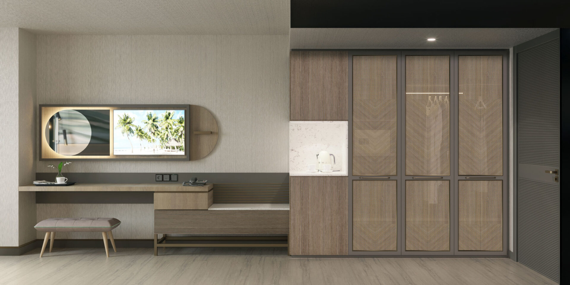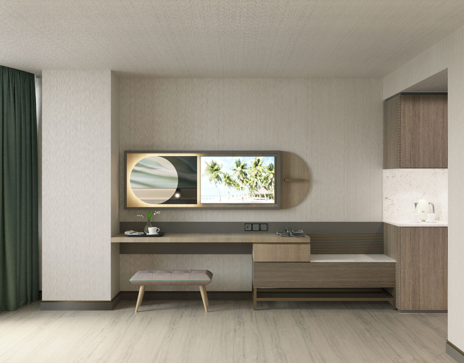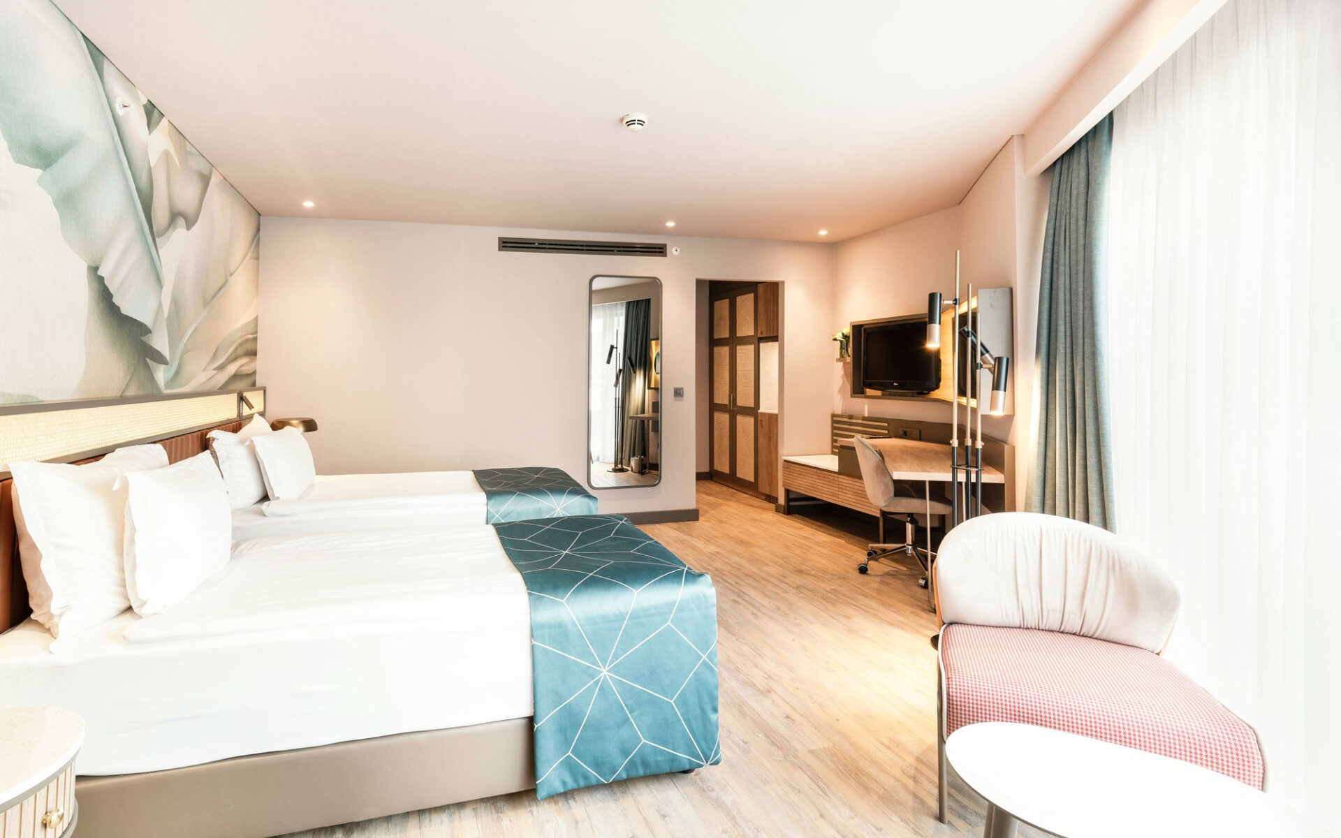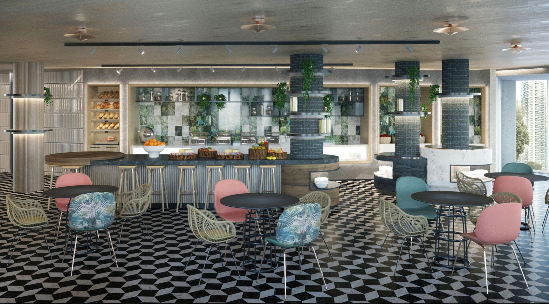 A magnificent coalescence of the patterns applied to both materials and appliances and pastel tones. The walls and the ceilings are designed to be displayed as artworks with the integration of lightning. A dreamy, green design approach welcomes the visiters with it’s energetic, joyful elegance.