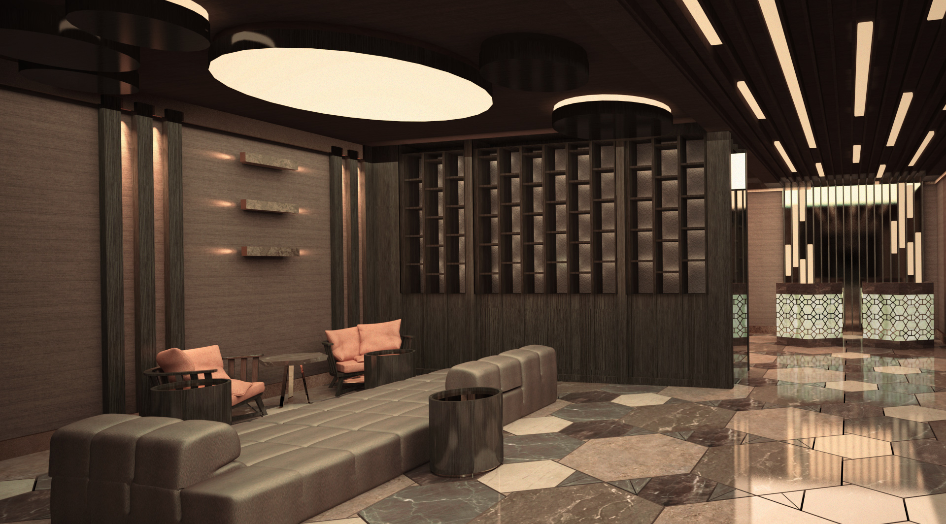 The Hotel is designed to create a seperate independent space far away from the city living rush. The usage of dark colors with light usage plays with the perception of height so creates a completely different experience, where the continuous patterns are defining functional areas in the hotel that is creating a dynamism in the area.
