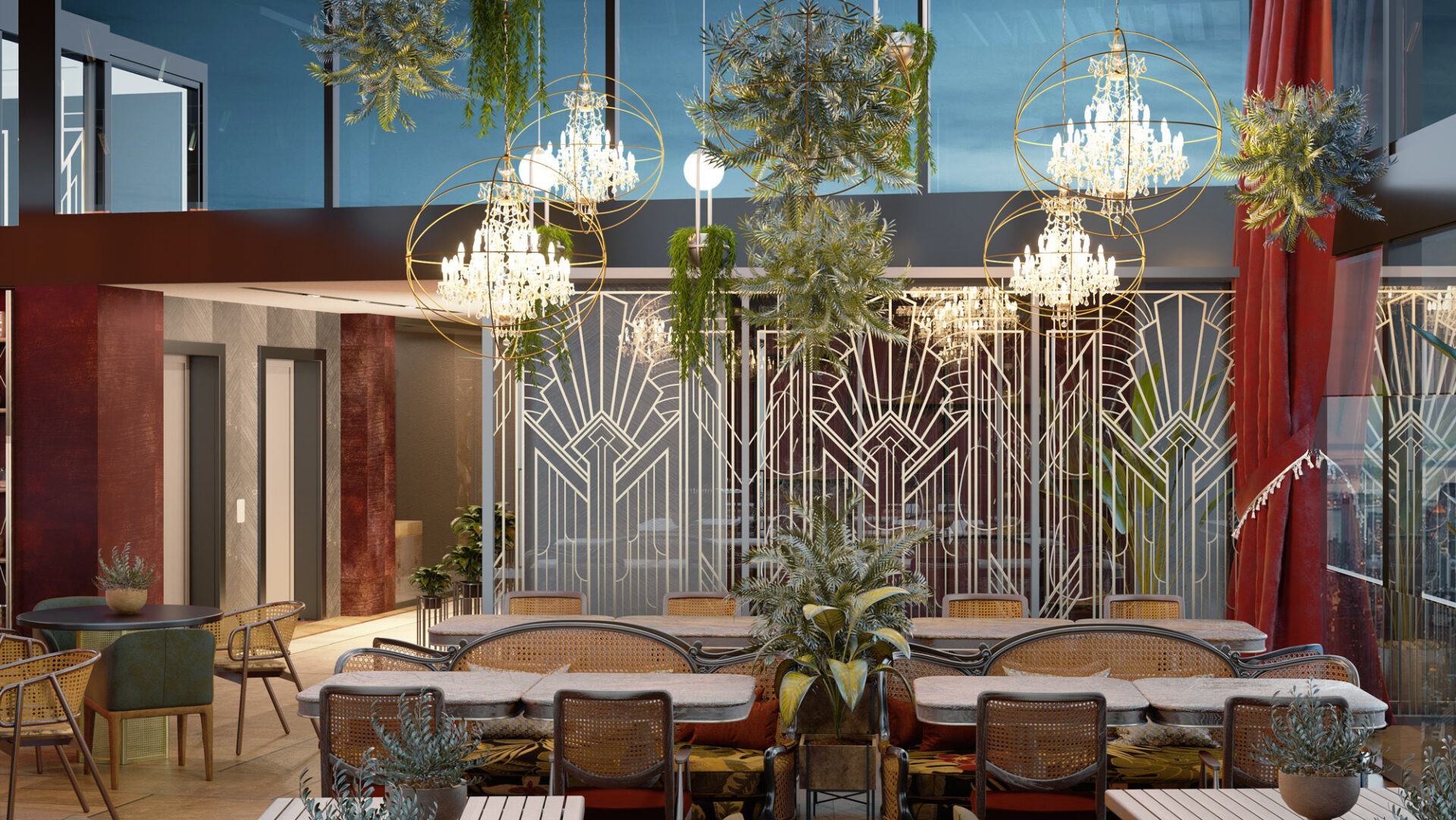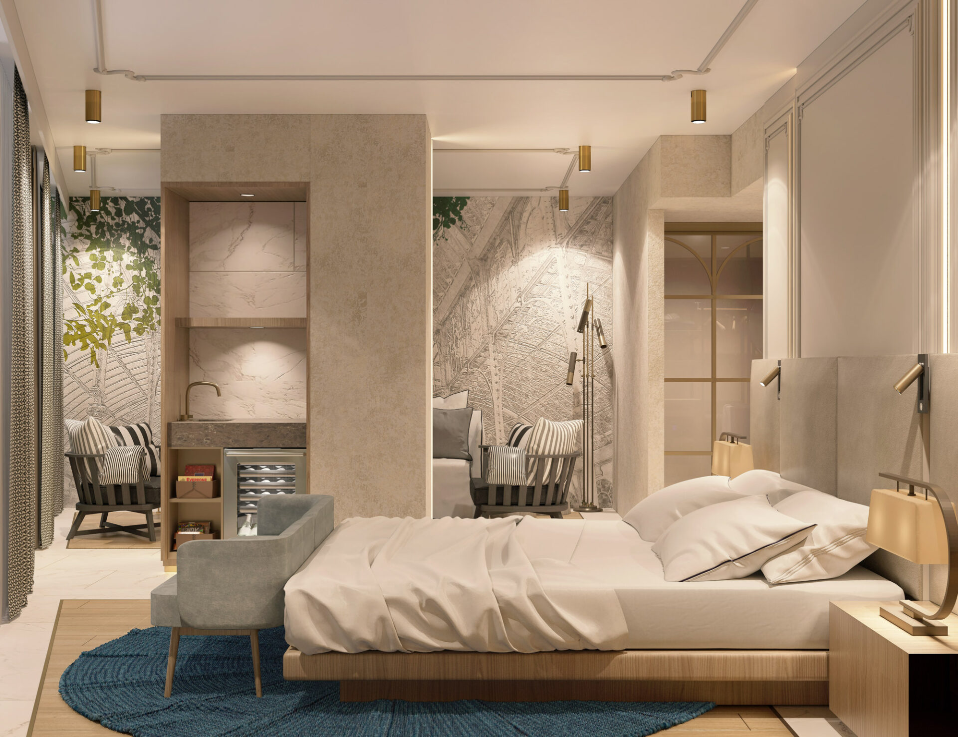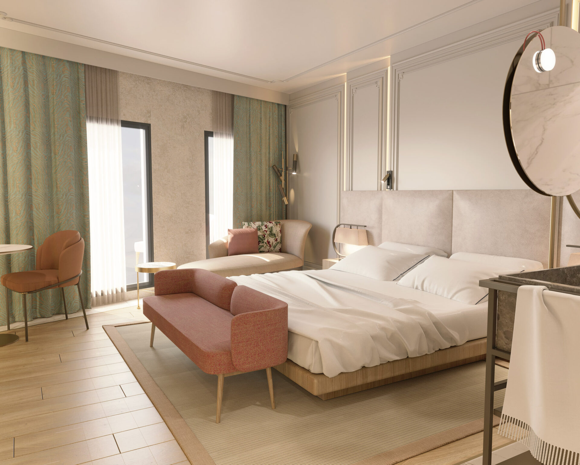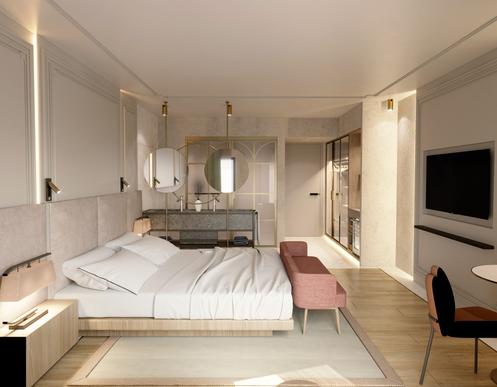 The hotel project is bringing a different perspective to city hotel concept by it’s dynamic and warm design. The floors are transforming from daily life comfort to luxurious joy as it gets to roof. The rooms are designed with the contrast of warm colors with cold material, where they also include the essentials of the entrance of the hotel and the roof, so that it’s a transition between the grandeur and a personal comfort space with practical solutions.